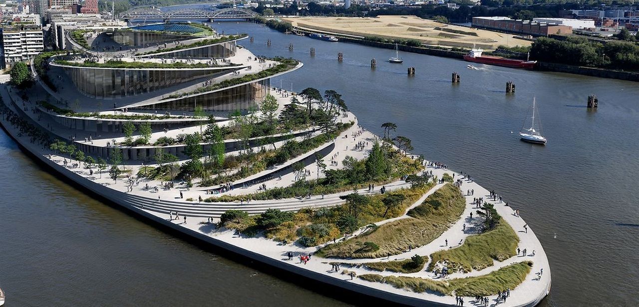 Die Bauweise umfasst geschichtete Balkonvorsprünge, die in eine geschwungene Spiralkonfiguration aus Dachgärten übergehen. Dort werden ausschließlich einheimische Baumarten, Sträucher und Gräser angeordnet, um lokale Ökosysteme zu fördern. Der Park ist öffentlich zugänglich und bietet aufgeständerte Grünflächen, gepairt mit Sitzstufen und Laufpfaden. Aus dieser erhöhten Perspektive eröffnen sich Panoramafenster auf das Ensemble der HafenCity, auf die Containerterminals des Hafens und auf das breite Flussbett der Elbe. Wegemarkierungen unterstützen die individuelle Route.
